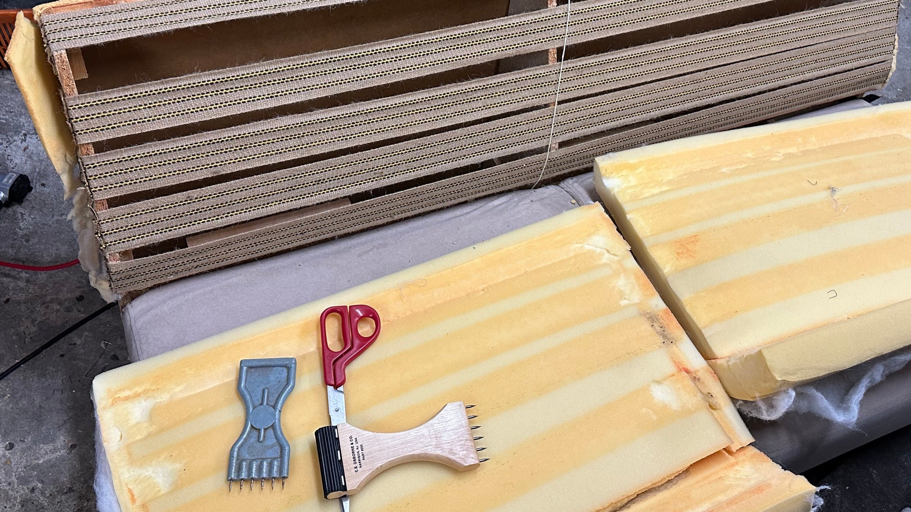 Voor we starten met de reparatie, inspecteren we het meubel zorgvuldig. Vaak maken we tijdelijk het doek aan de onderkant los om het binnenwerk te controleren en te herstellen.