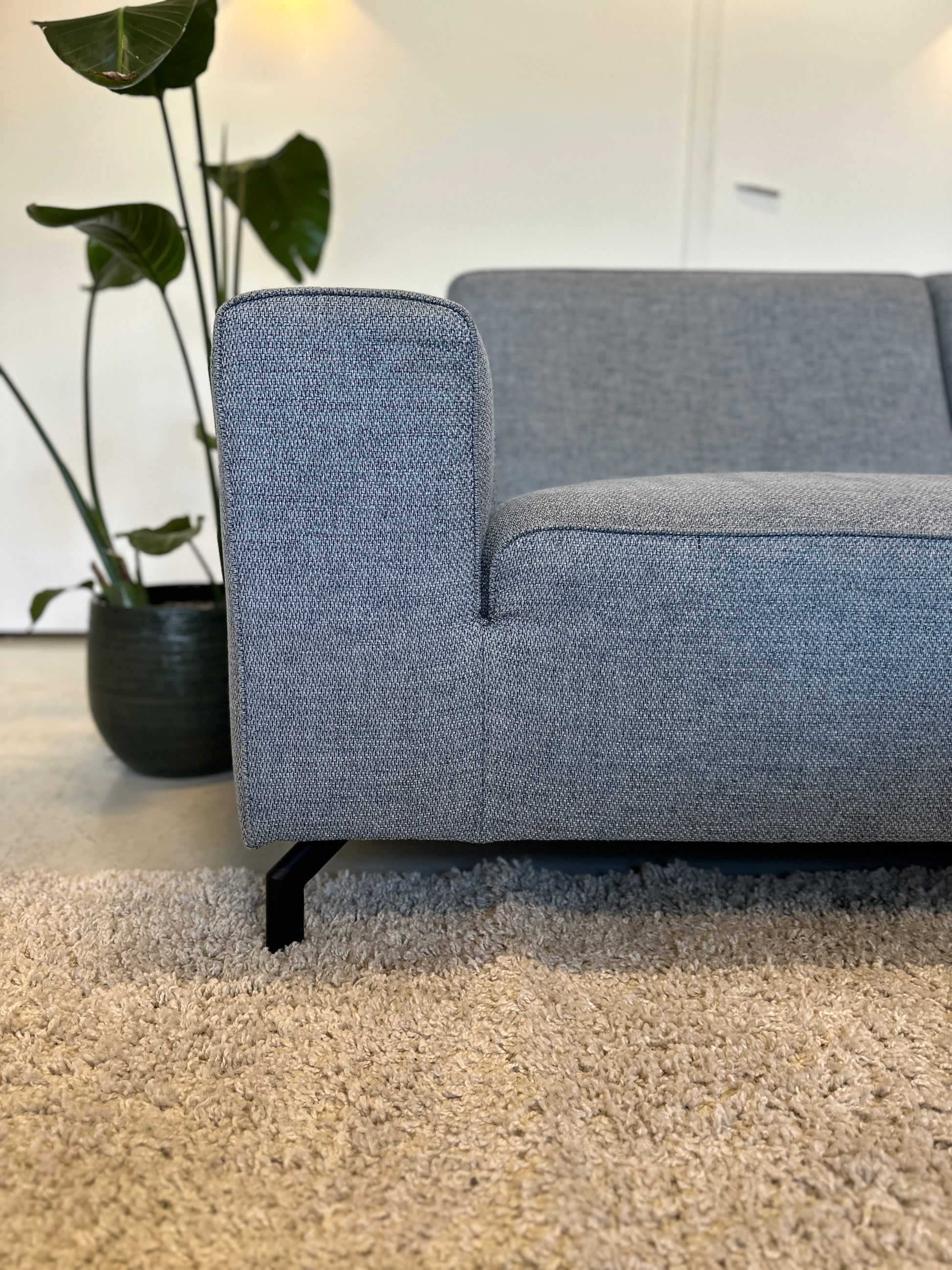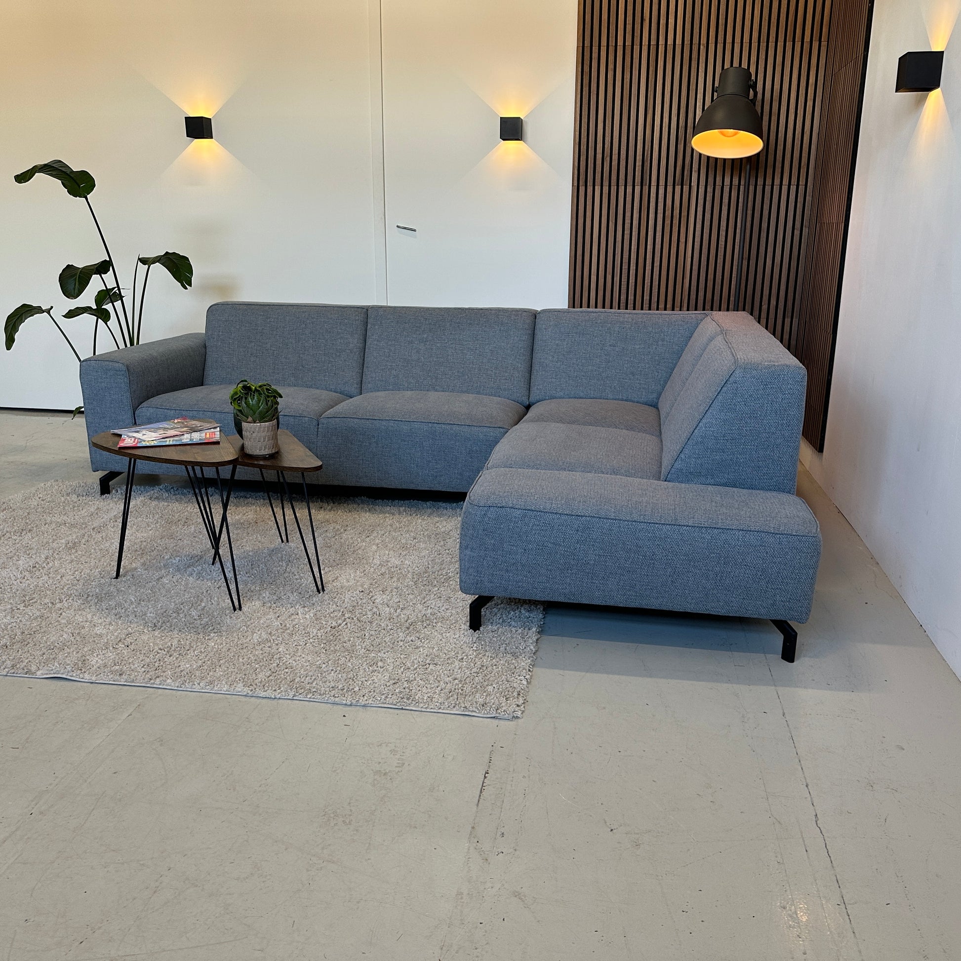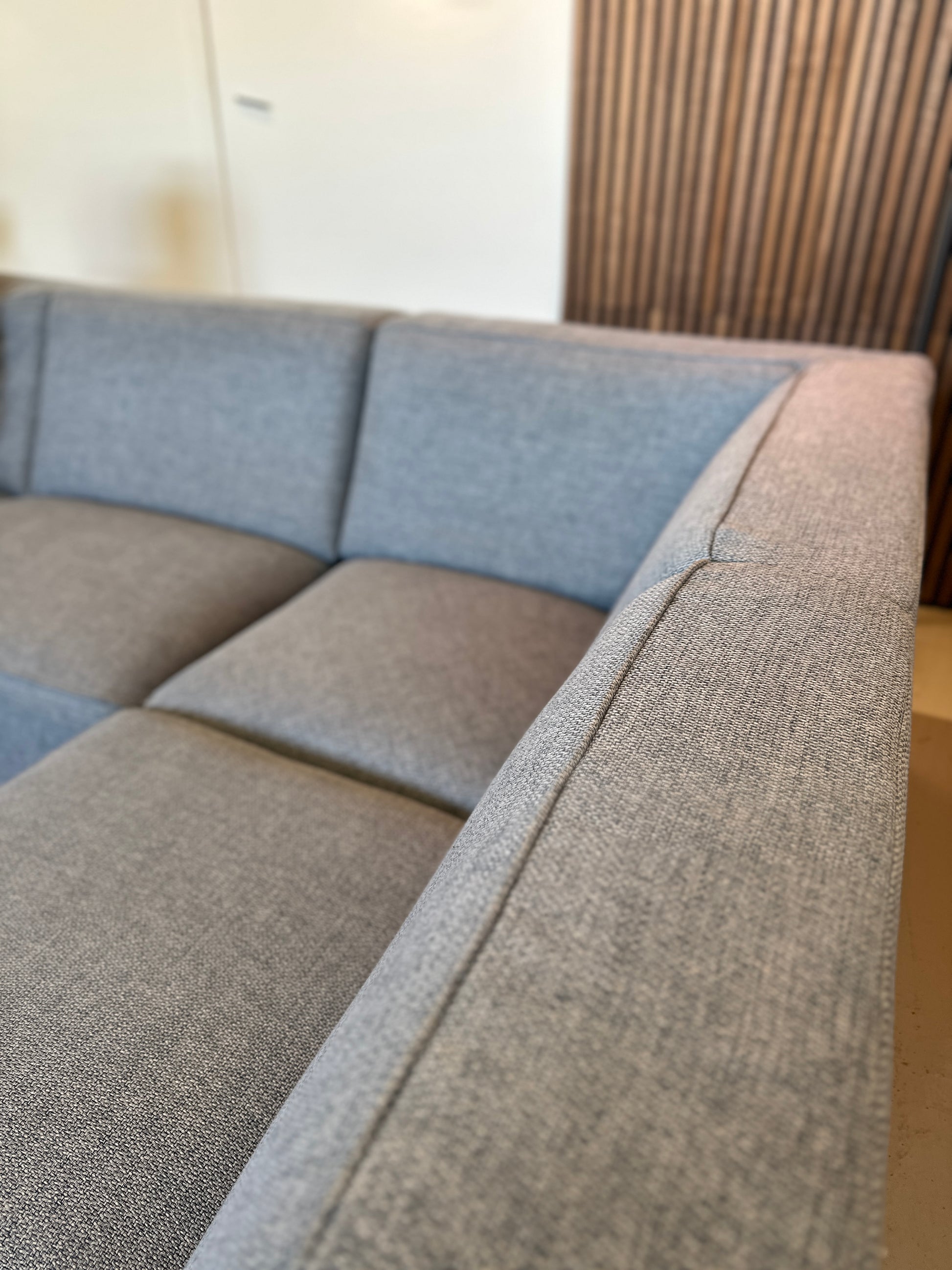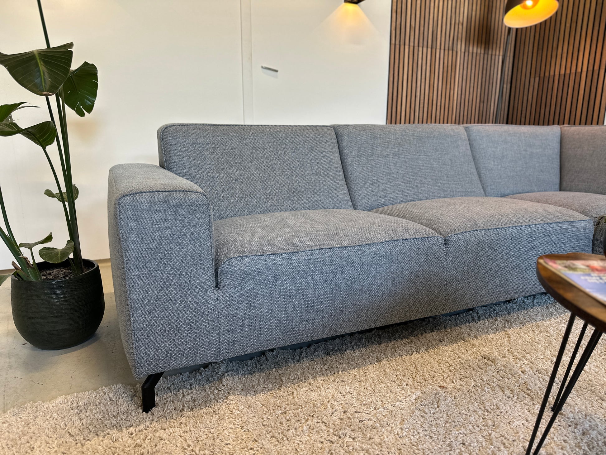 Deze moderne hoekbank in lichtgrijze stof straalt rust en elegantie uit. De strakke lijnen en slanke zwarte poten geven een frisse, eigentijdse look. De bank biedt een comfortabele, ondersteunende zit en past moeiteloos in vrijwel elk interieur. Een ruime en stijlvolle toevoeging aan jouw woonkamer.