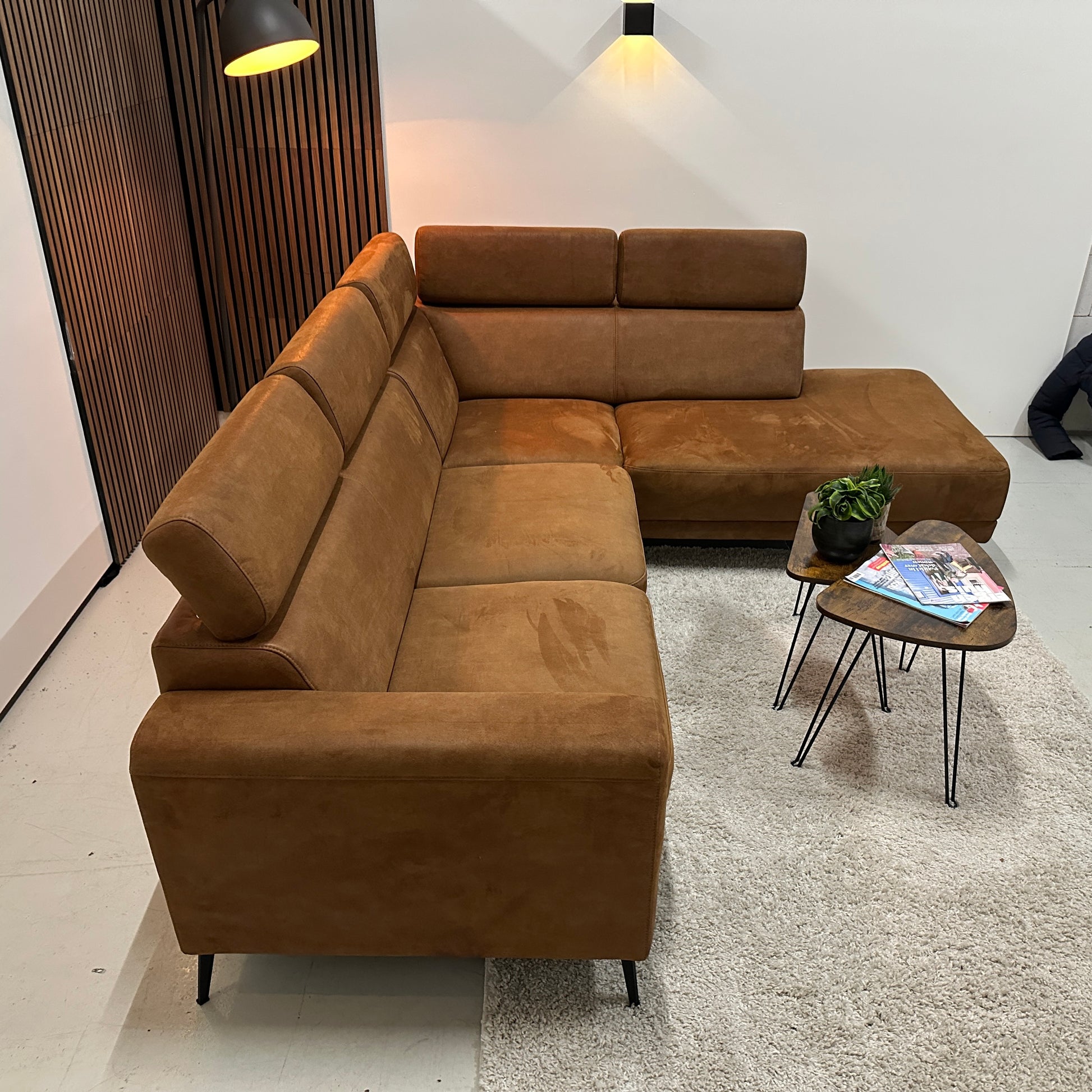 Deze hoekbank in warme cognackleur straalt klasse en comfort uit. De zachte microleder bekleding voelt luxe aan en is bovendien onderhoudsvriendelijk. De verstelbare hoofdsteunen en strakke lijnen zorgen voor een moderne, stijlvolle uitstraling. Perfect om heerlijk op te ontspannen en je interieur een warme, eigentijdse look te geven.
