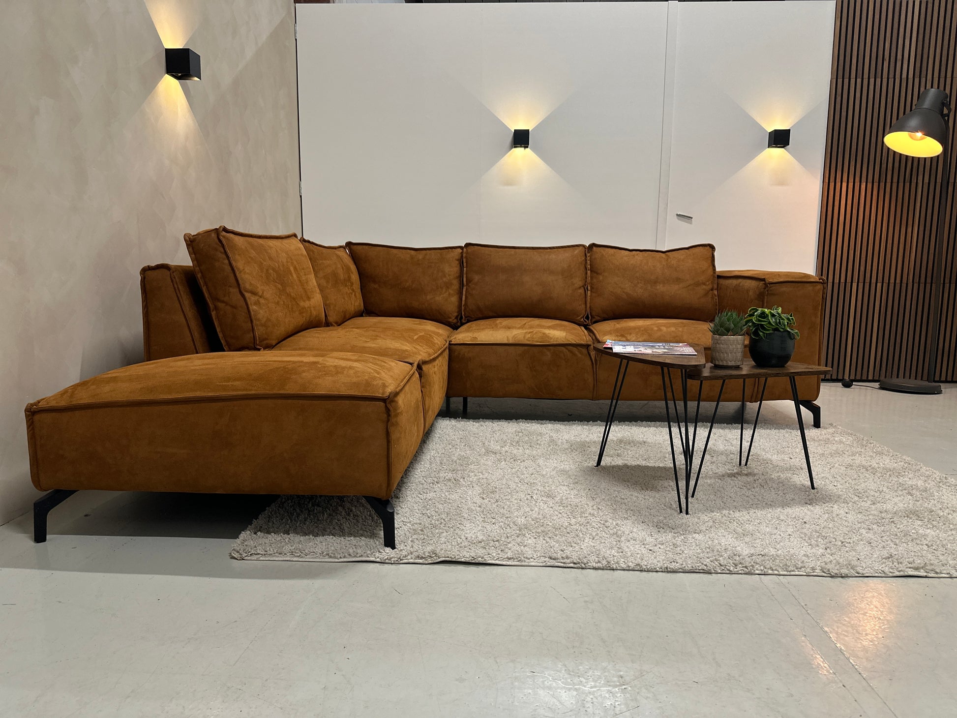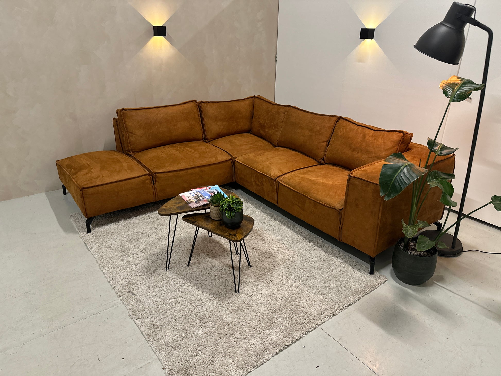 Deze hoekbank in warme cognackleur heeft een luxe uitstraling dankzij de ecoleder bekleding. De zachte touch en het matte, suède-achtige effect geven de bank een rijke en uitnodigende look. De royale zittingen en moderne zwarte poten zorgen voor een eigentijdse, comfortabele uitstraling. Een stijlvolle blikvanger die direct warmte toevoegt aan je interieur.