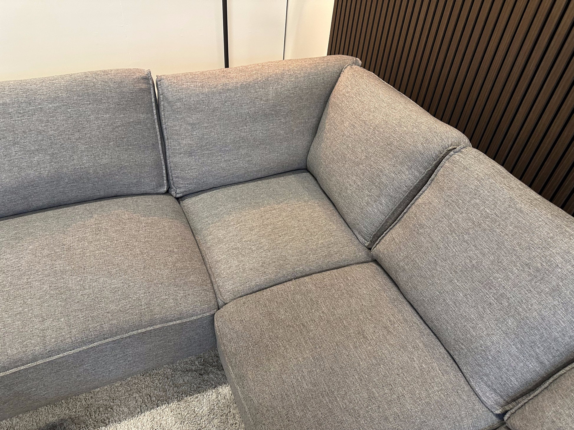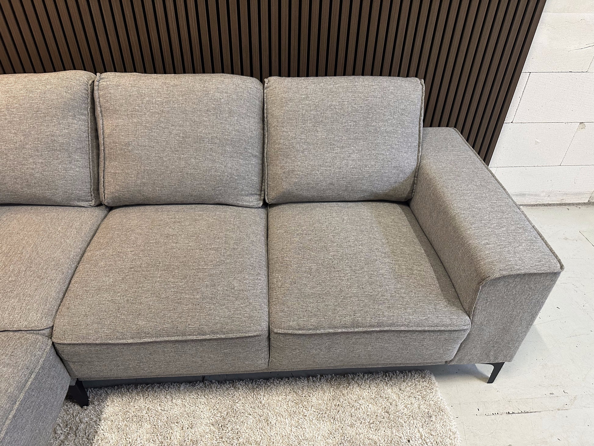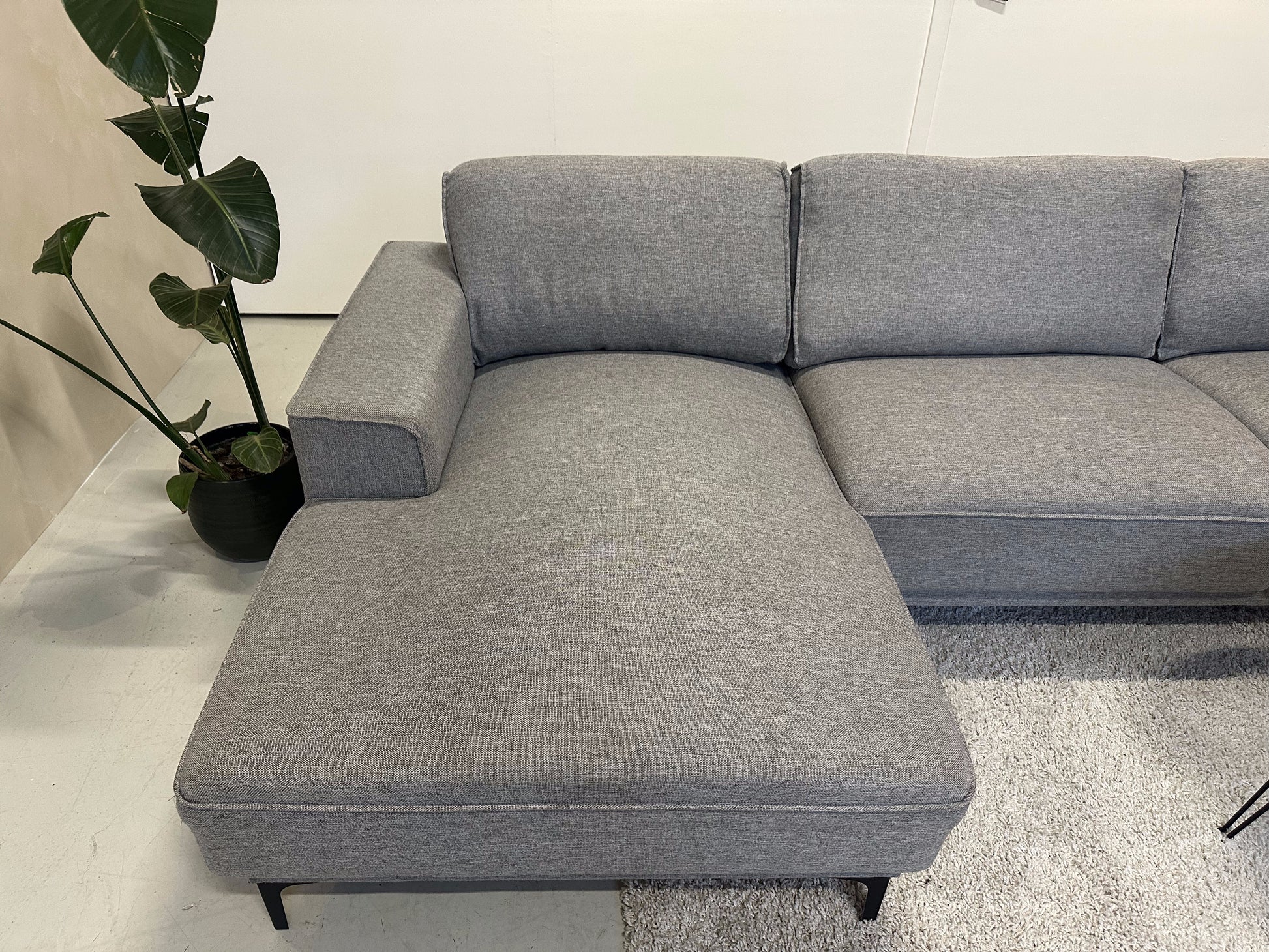 Deze ruime hoekbank in grijze stof biedt veel zitruimte en een comfortabele chaise longue om languit te zitten. De slanke zwarte poten geven de bank een moderne uitstraling, terwijl de neutrale kleur makkelijk te combineren is met verschillende woonstijlen. Een praktische en comfortabele bank voor dagelijks gebruik. Klaar voor een nieuw thuis.