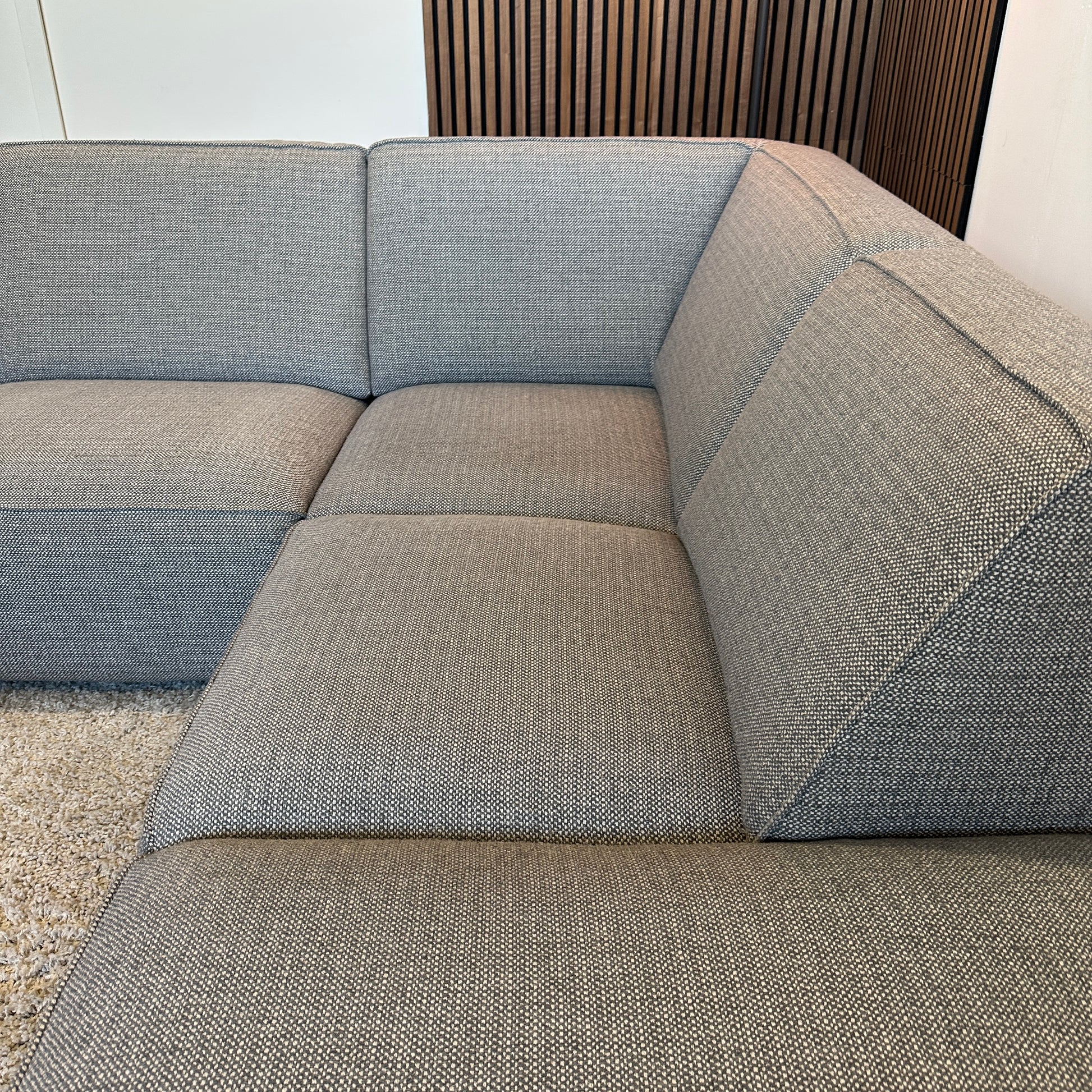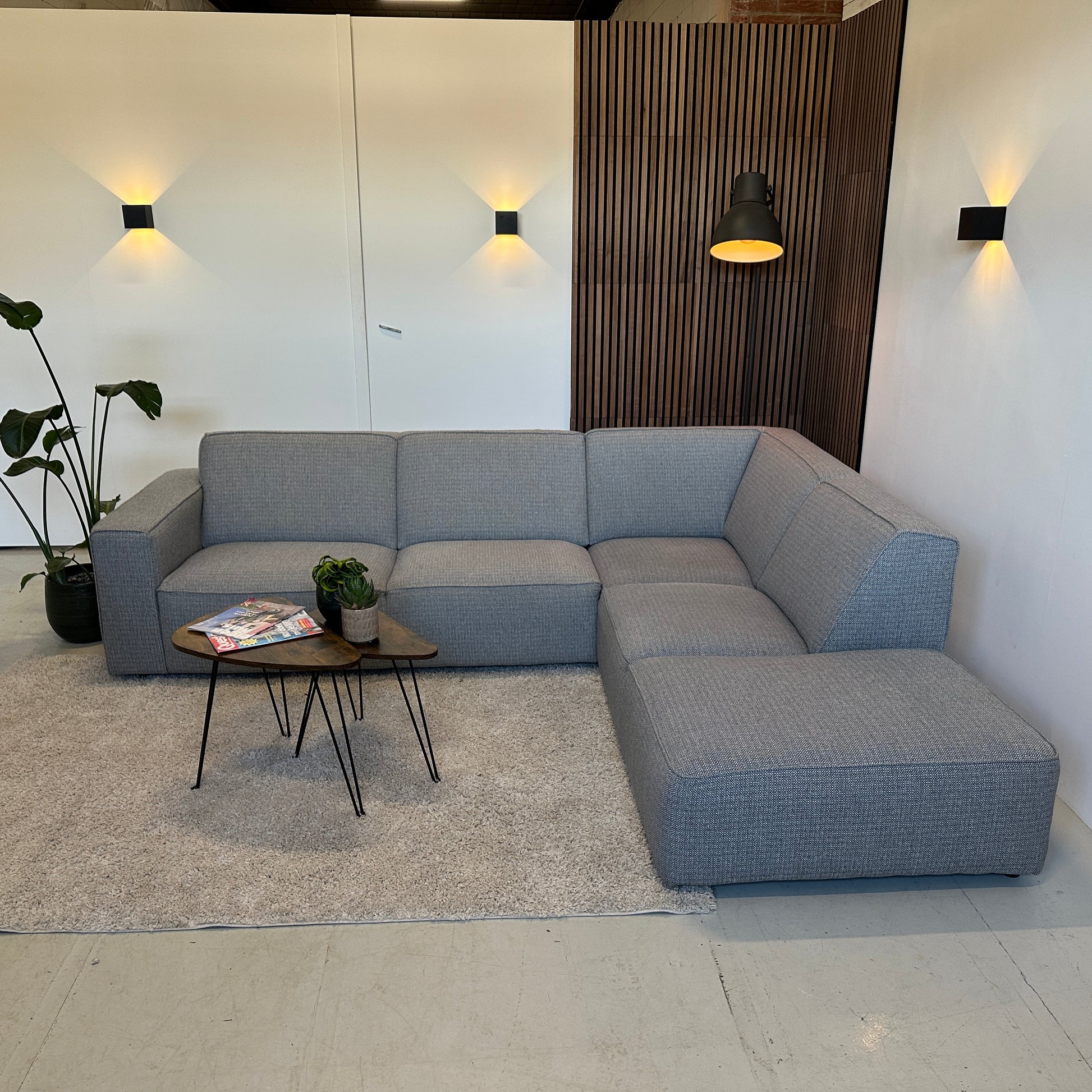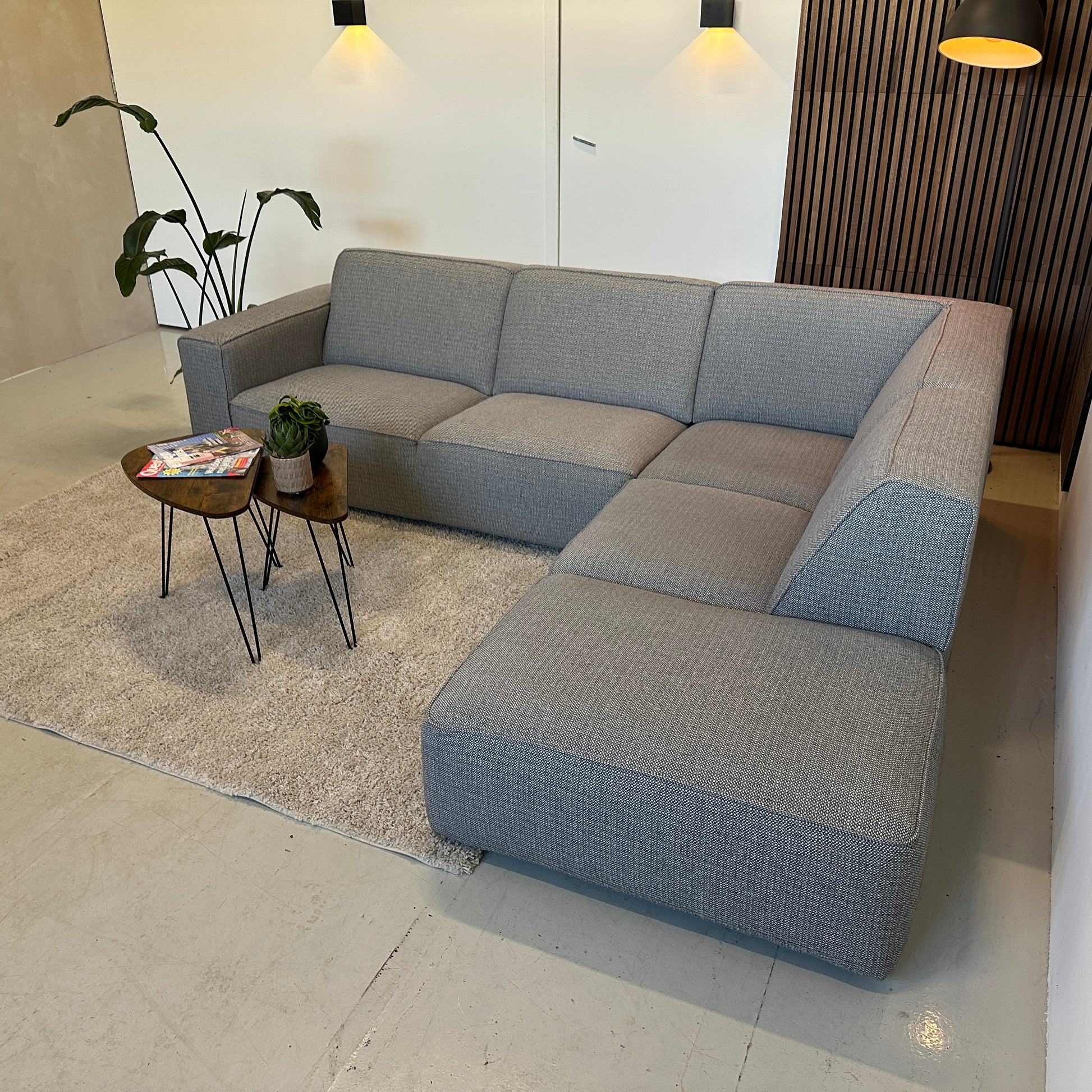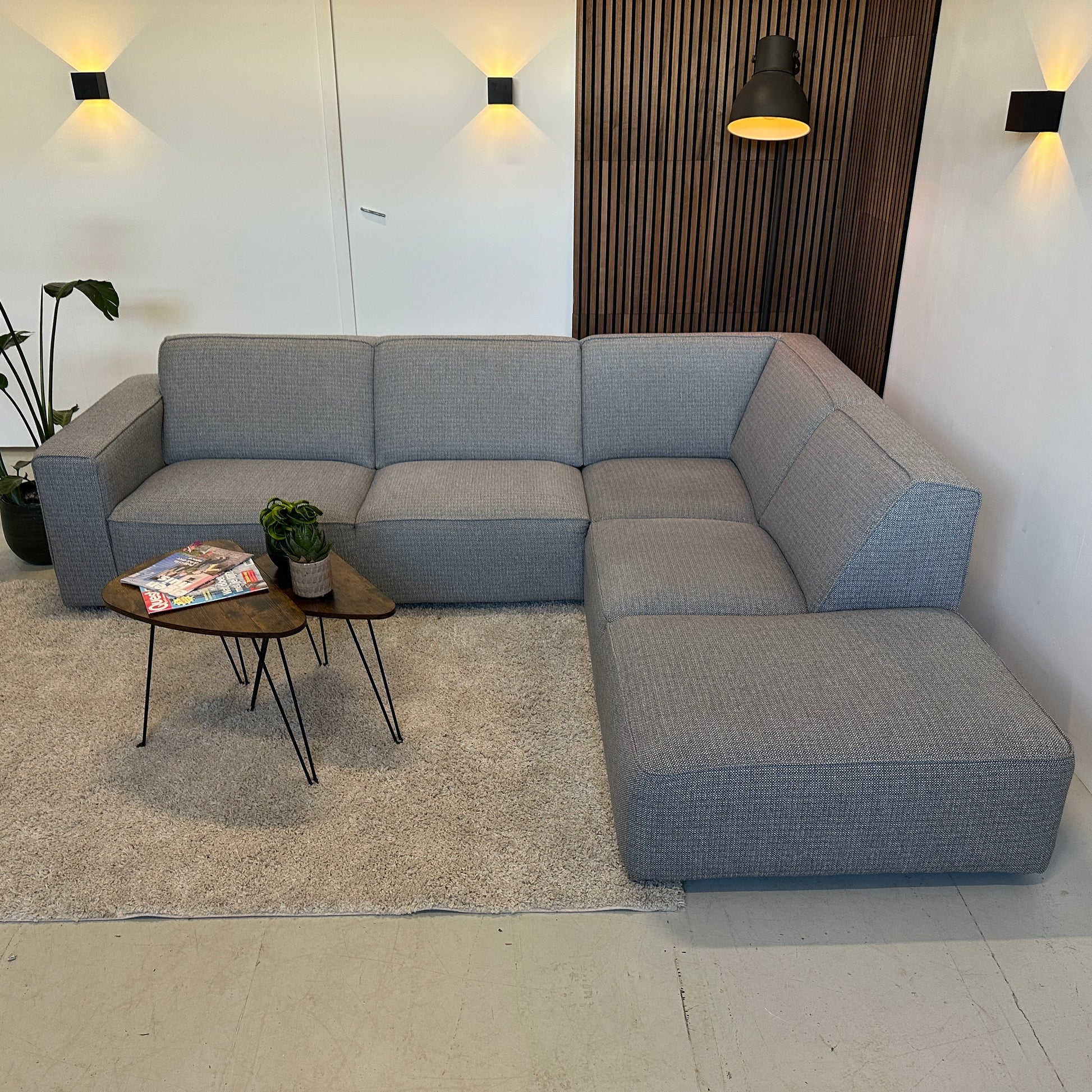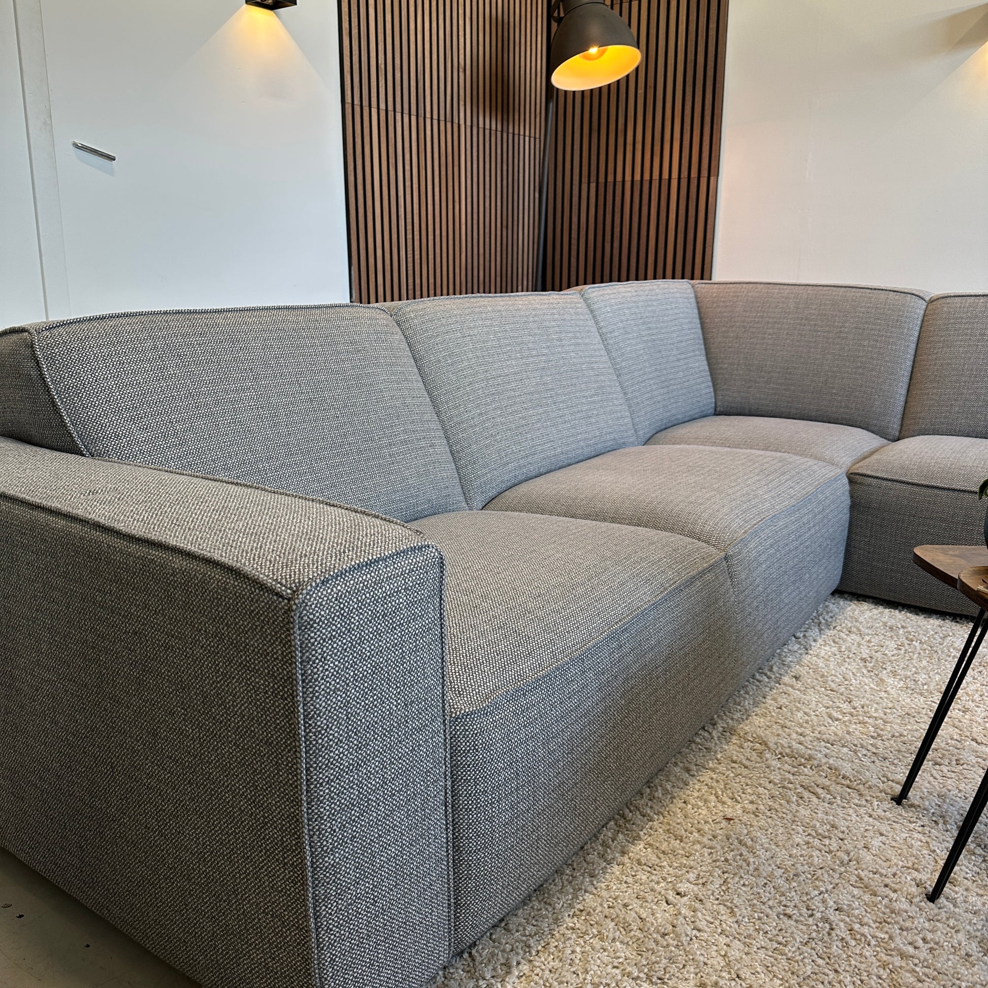 Deze moderne hoekbank in lichtgrijze stof combineert strakke lijnen met heerlijk zitcomfort. De royale zitting en brede armleuningen zorgen voor een ontspannen uitstraling, terwijl het minimalistische design perfect past in een eigentijds interieur. Een stijlvolle bank die rust en comfort brengt in elke woonruimte.