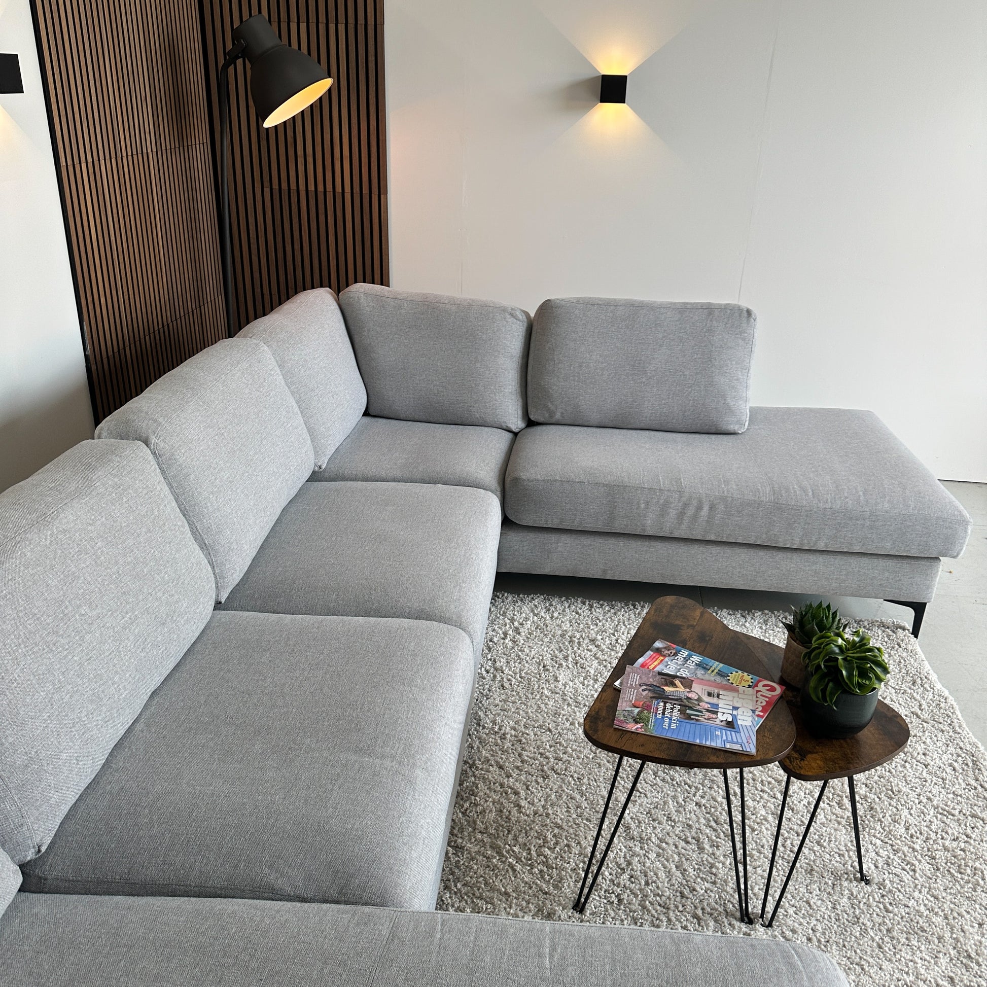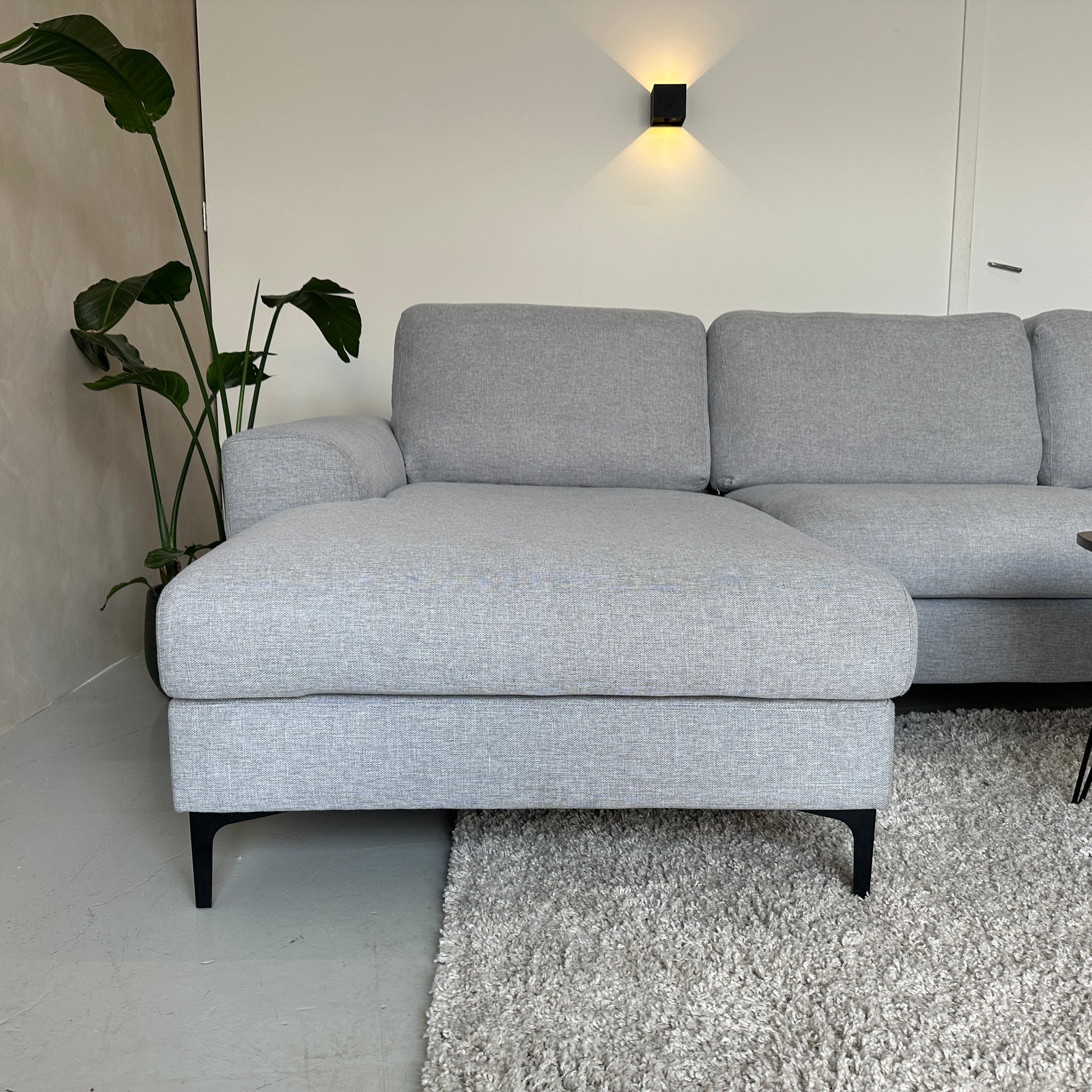 Deze ruime hoekbank in lichtgrijze stof straalt rust en elegantie uit. De zachte zit biedt heerlijk comfort, ideaal om lekker in weg te zakken na een lange dag. De strakke lijnen en zwarte poten geven de bank een moderne uitstraling. Een stijlvolle en comfortabele toevoeging aan ieder interieur.