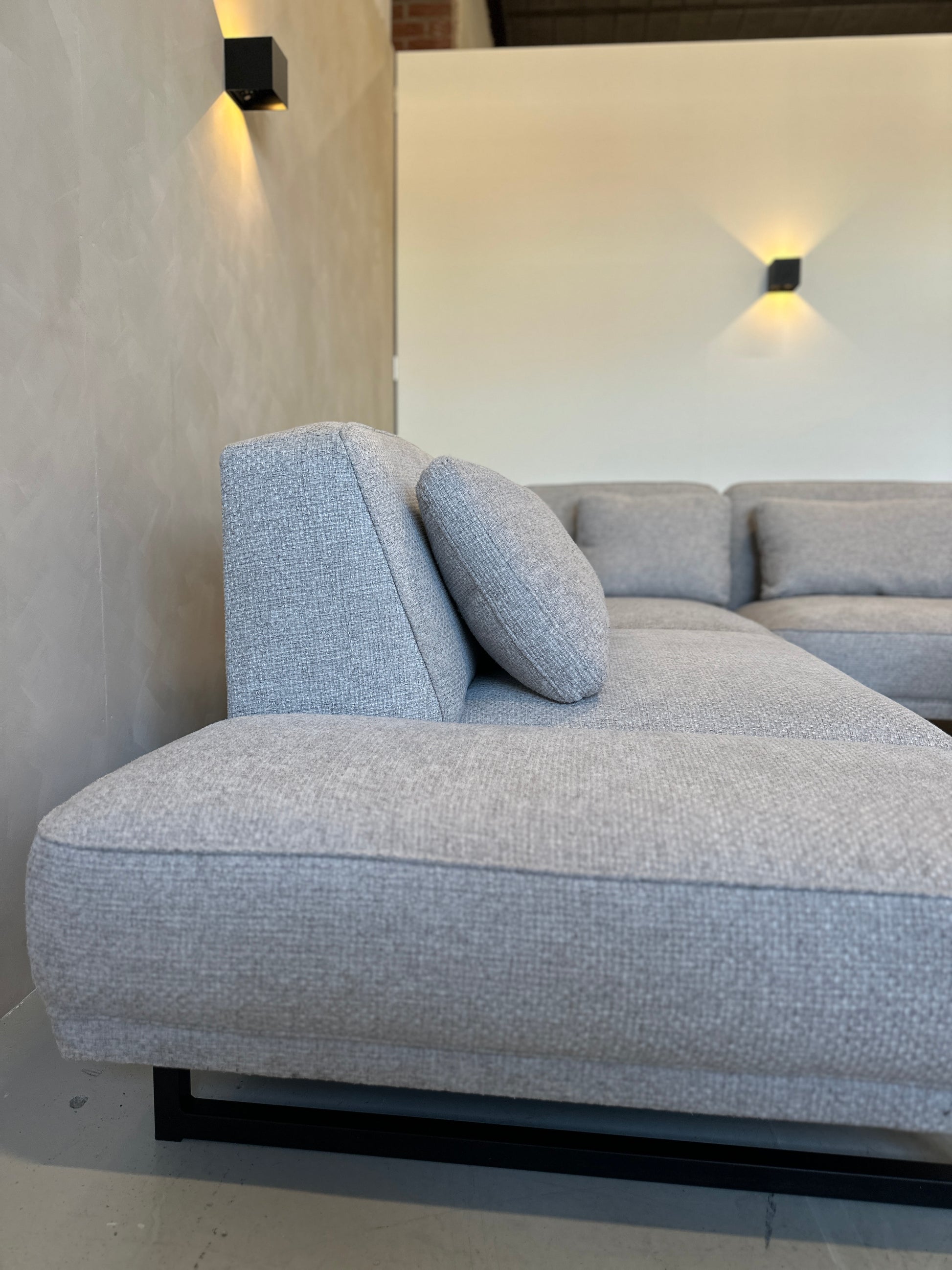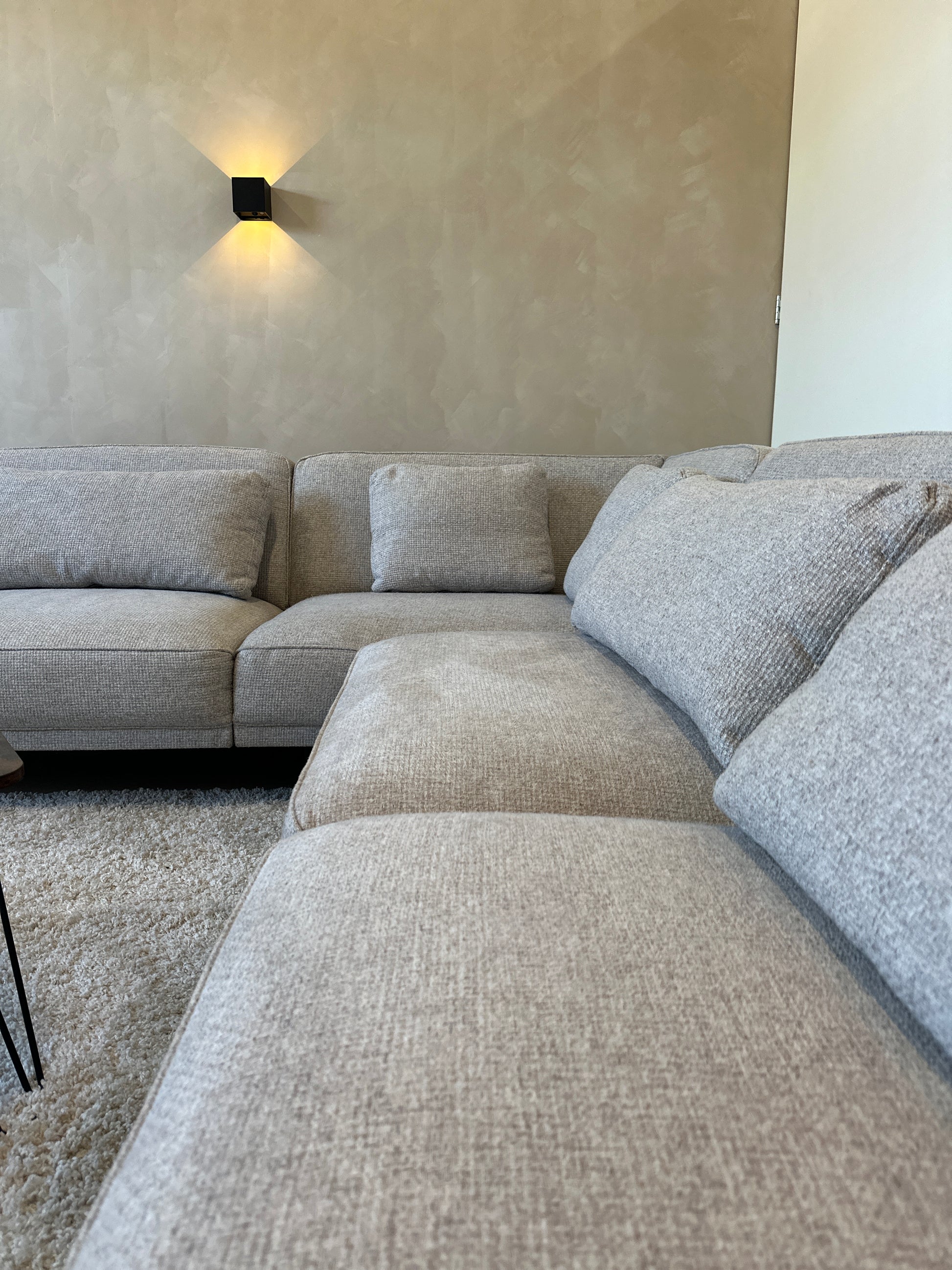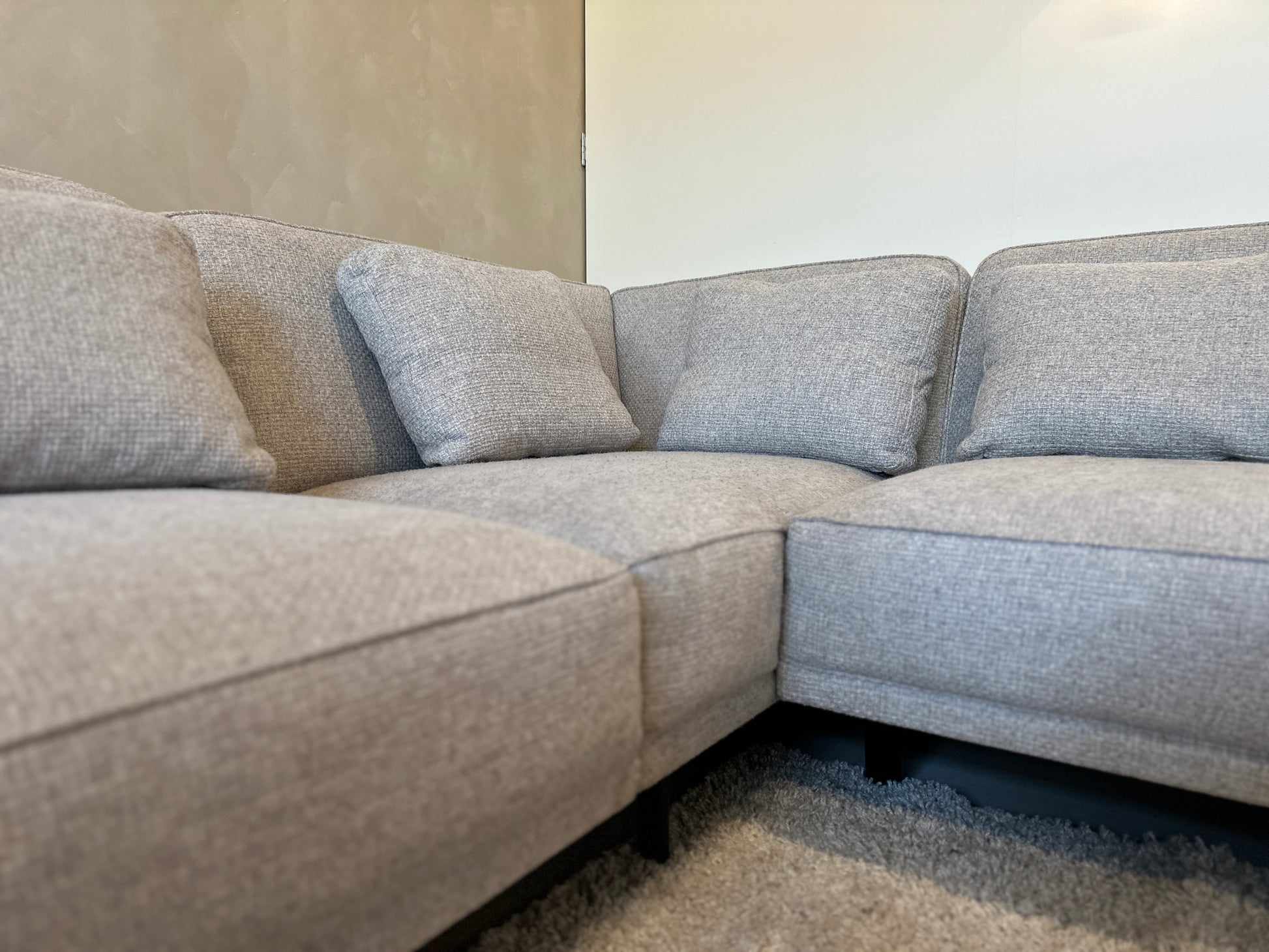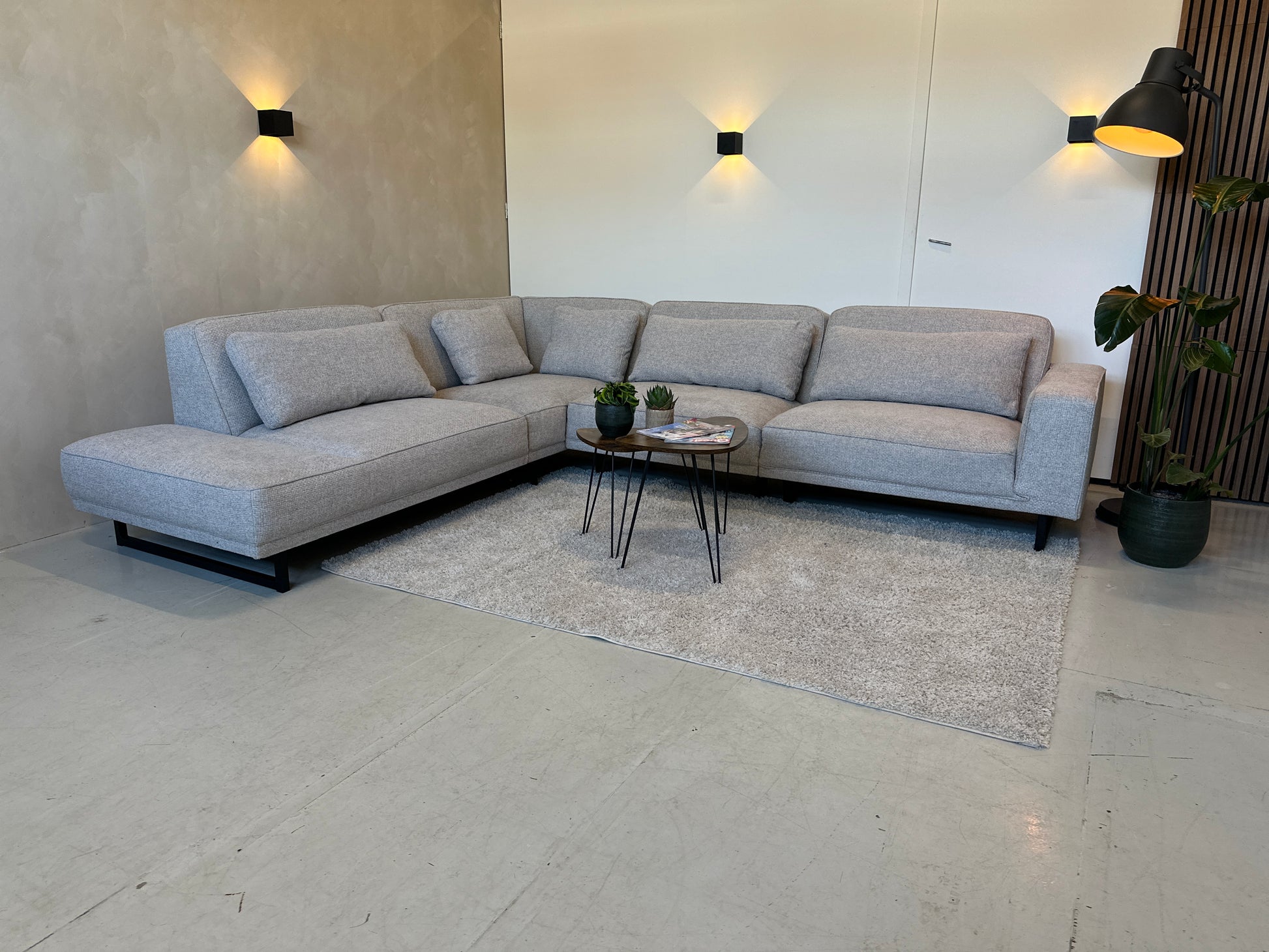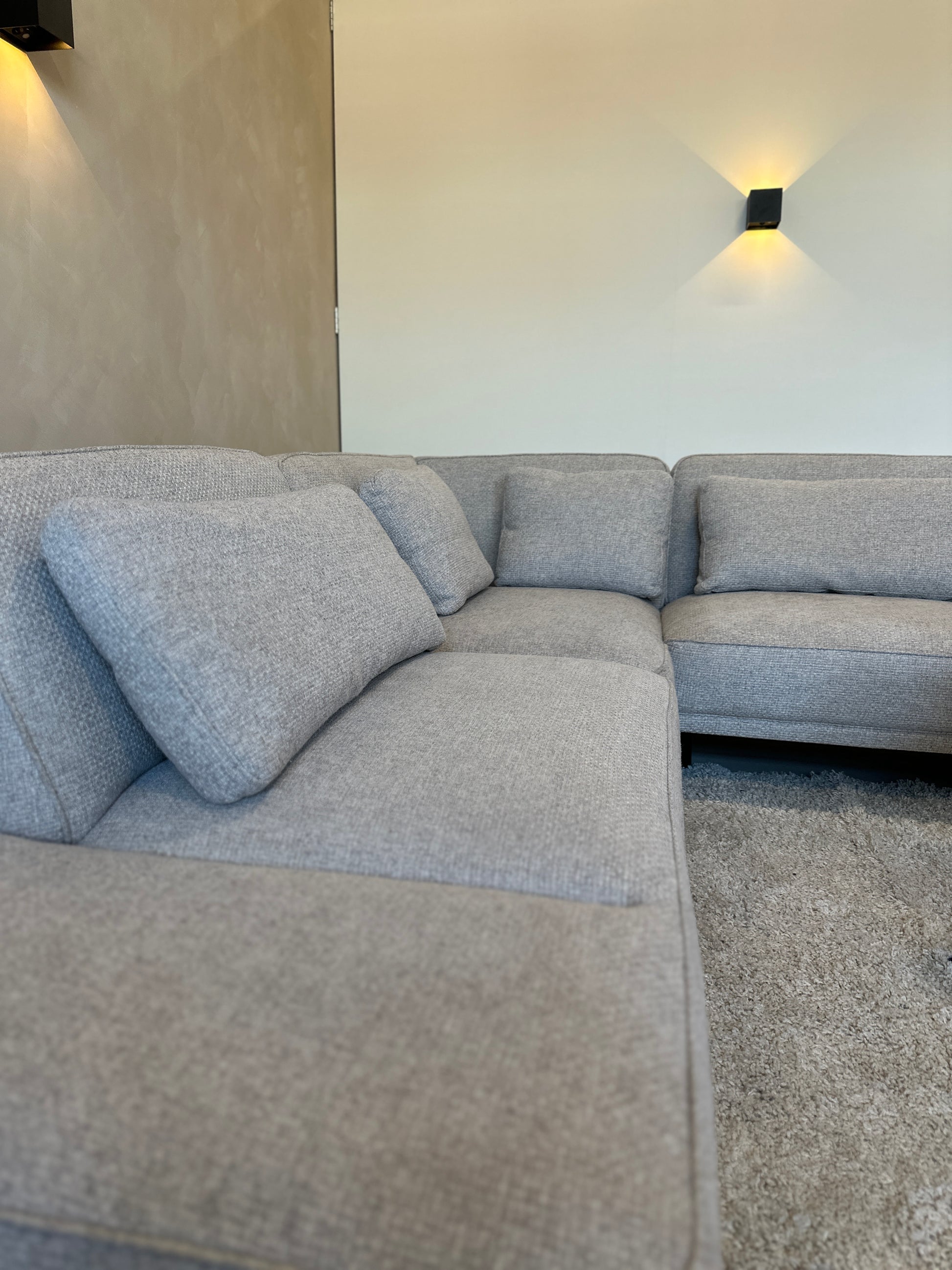 Deze moderne hoekbank in lichtgrijze stof straalt rust en elegantie uit. De brede zittingen en losse kussens zorgen voor een ontspannen, comfortabel zitgevoel. De strakke lijnen en zwarte poten geven de bank een eigentijdse, luxe uitstraling. Een ruime en stijlvolle bank die perfect past in een modern interieur.