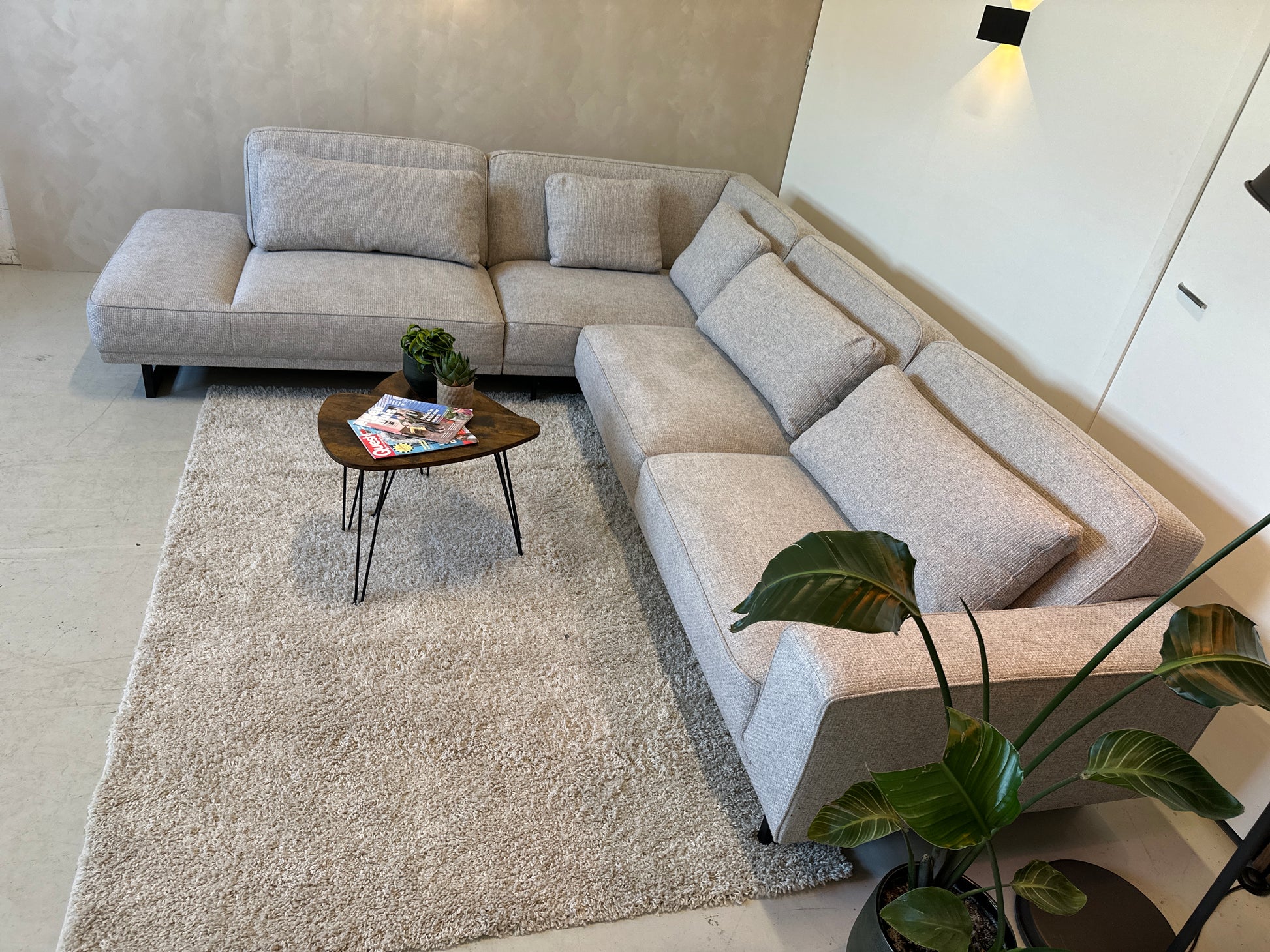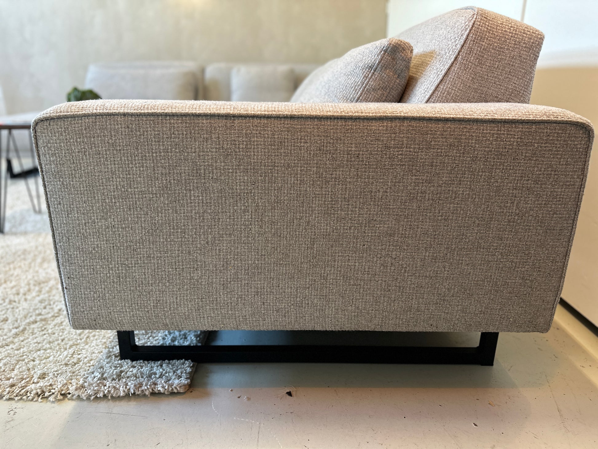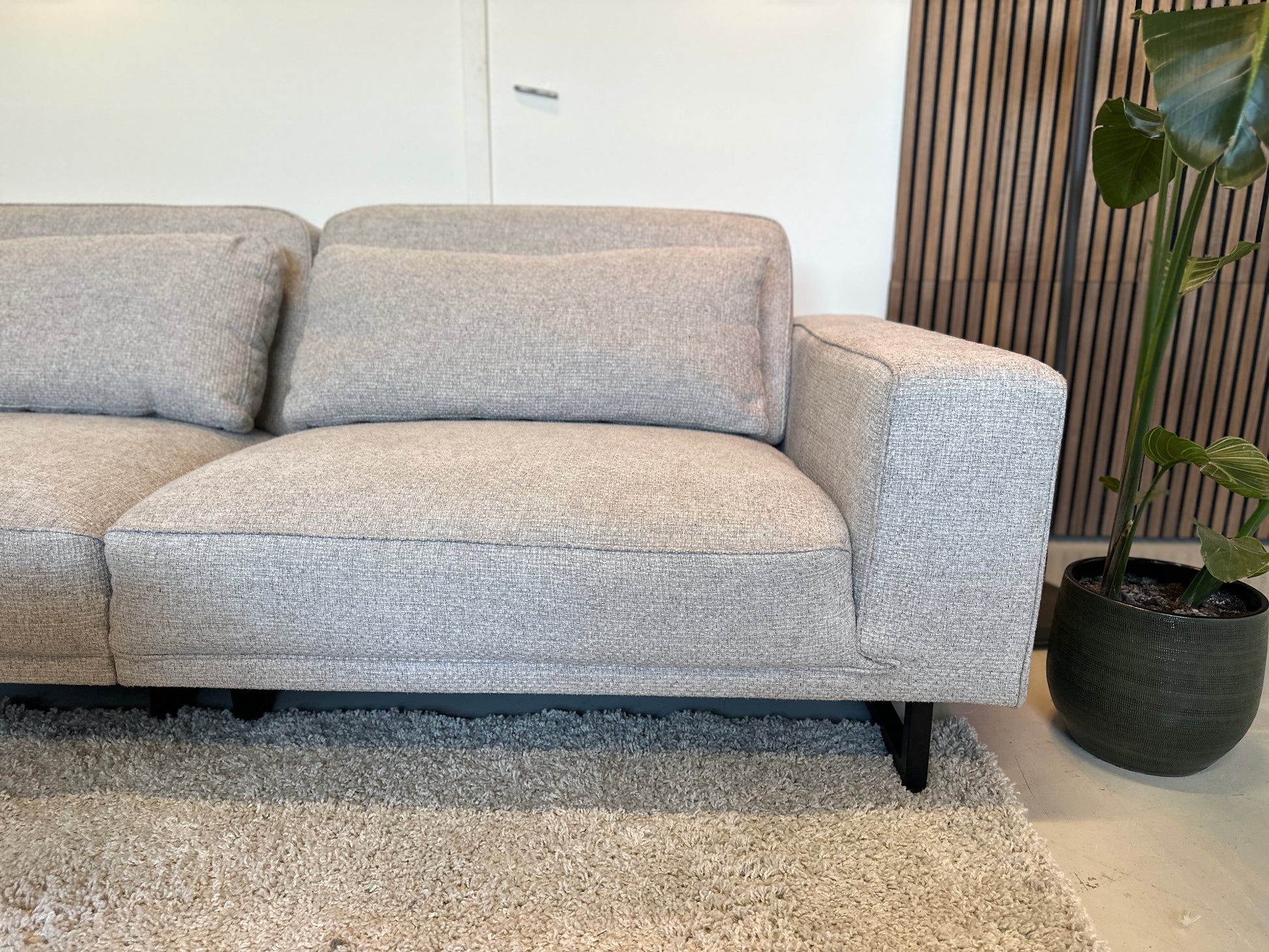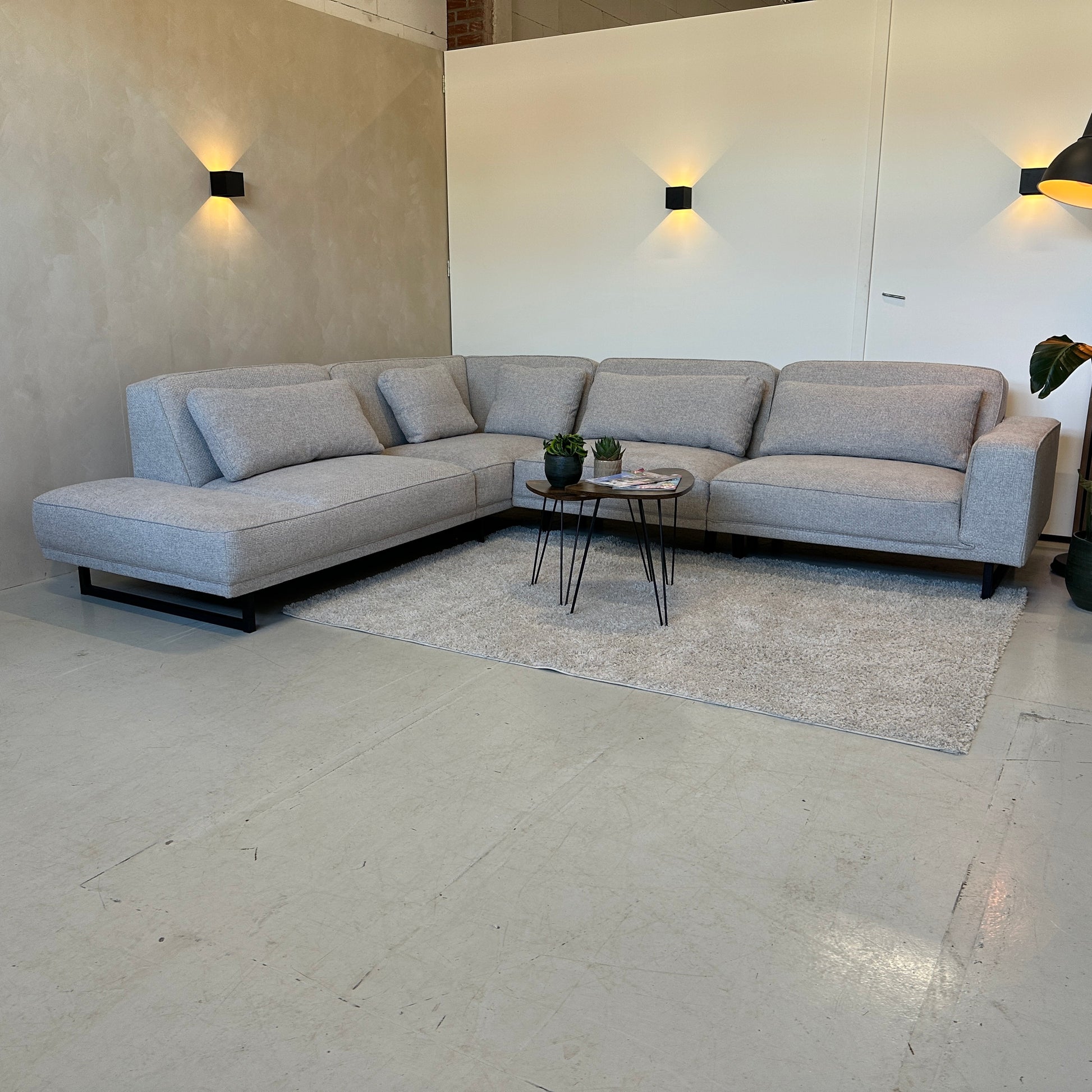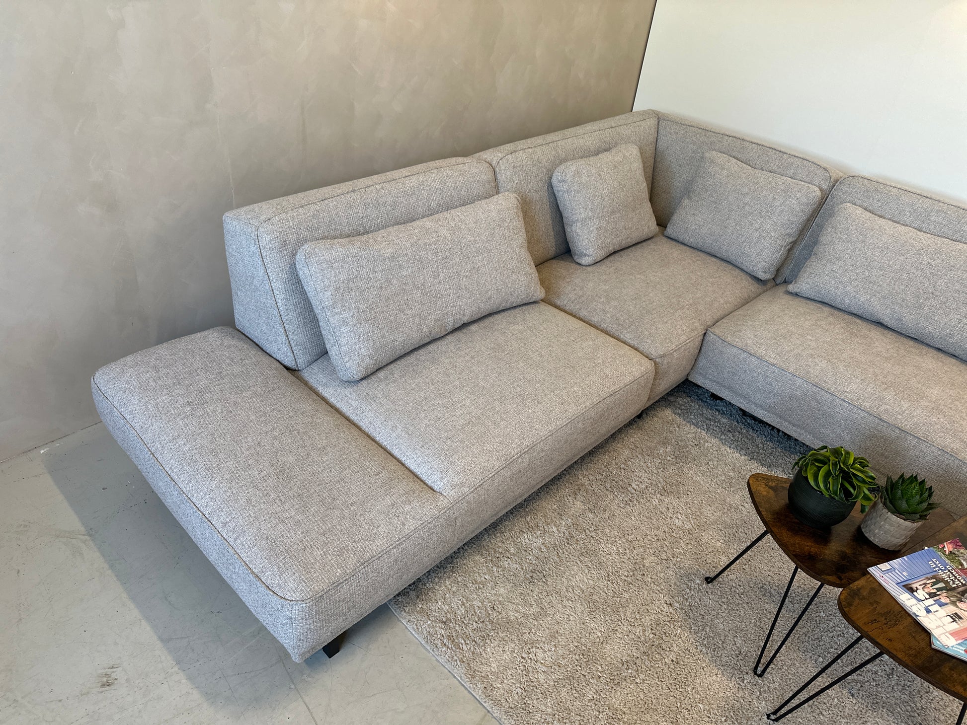Deze moderne hoekbank in lichtgrijze stof straalt rust en elegantie uit. De brede zittingen en losse kussens zorgen voor een ontspannen, comfortabel zitgevoel. De strakke lijnen en zwarte poten geven de bank een eigentijdse, luxe uitstraling. Een ruime en stijlvolle bank die perfect past in een modern interieur.