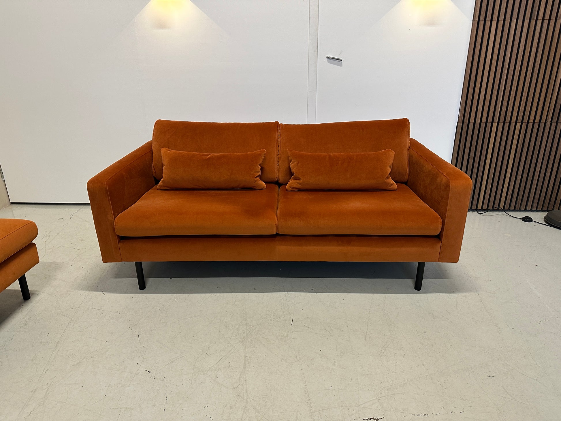 Deze bank met bijpassende hocker brengt warmte in je interieur. De diepe, koper kleurige stof geeft karakter en sfeer, terwijl de comfortabele zit uitnodigt om lekker te ontspannen. De hocker gebruik je als extra zitplek, voetenbank of salontafel met een dienblad. Compact van formaat, groots in uitstraling. Klaar voor een nieuw thuis.